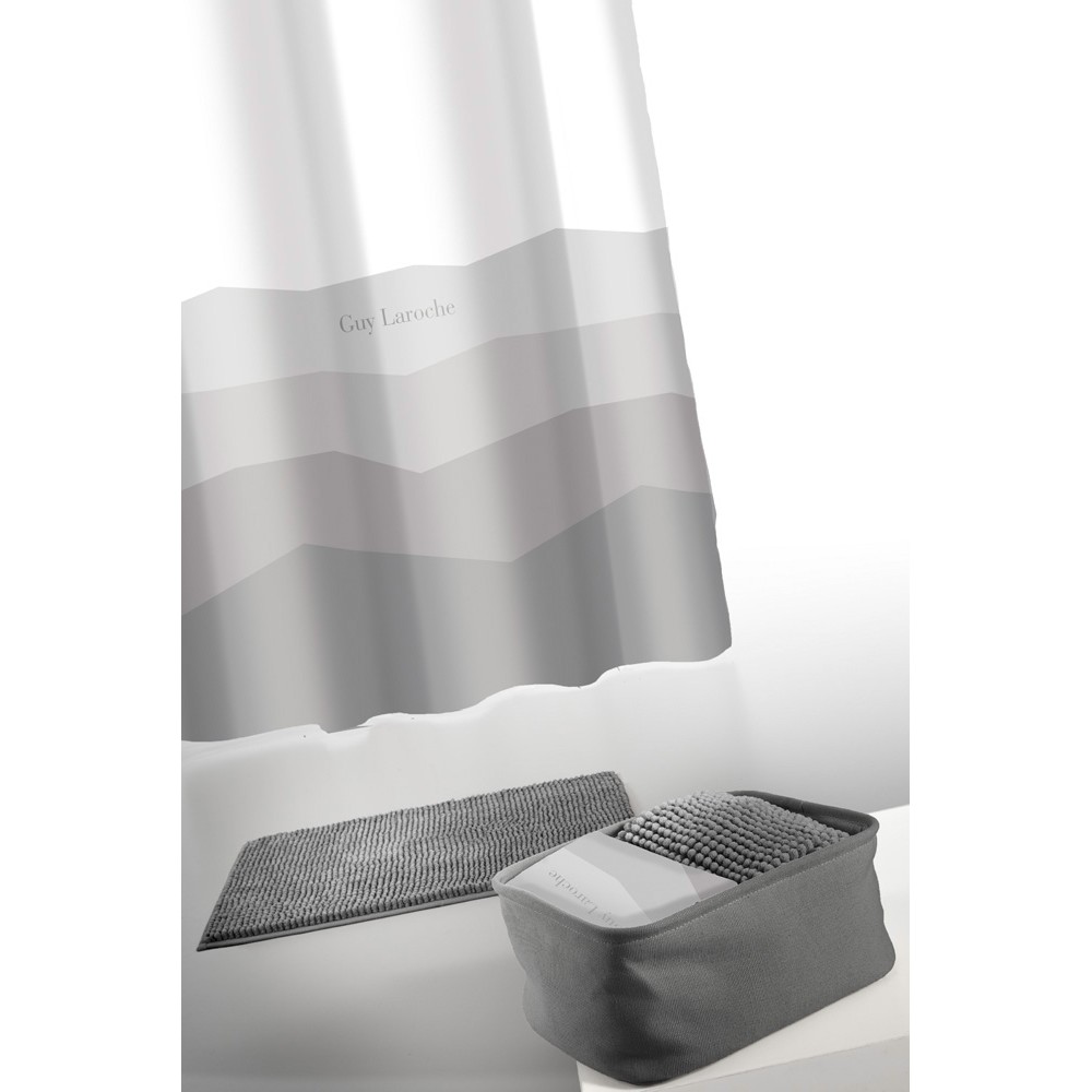 Σετ μπάνιου αποτελούμενο από 4 τεμάχια, υφασμάτινη κουρτίνα μπάνιου κατασκευασμένη από 100% polyester διάστασης 180x180εκ., πατάκι μπάνιου διάστασης 40x60εκ., σετ 12 τεμάχια κρίκους για εύκολη τοποθέτηση και το καλάθι καλλυντικών. Μια ολοκληρωμένη πρόταση από την Guy Laroche Paris.