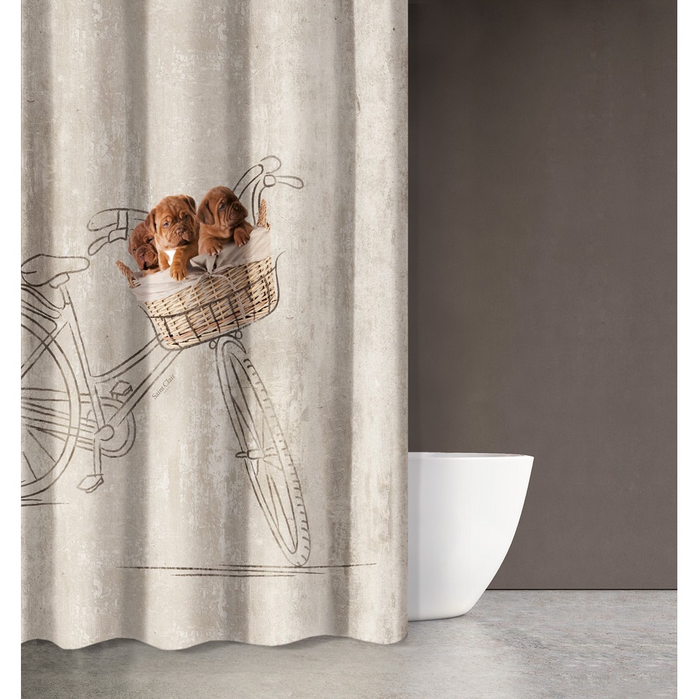 Υφασμάτινη κουρτίνα μπάνιου υδατοαπωθητική της εταιρίας Saint Clair Paris. Στεγνώνει γρήγορα και διαθέτει κρίκους για εύκολη τοποθέτηση. Σχέδιο Puppy μέσα σε καλάθι ποδηλάτου.