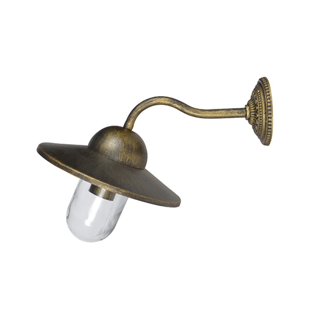 Κλασικό επιτοίχιο φωτιστικό εξωτερικού χώρου (μονόφωτη απλίκα) Κατασκευασμένο από κράμα αλουμινίου σε χρυσή πατίνα Ο λαμπτήρας προστατεύεται από γυάλινο κάλυμμα.