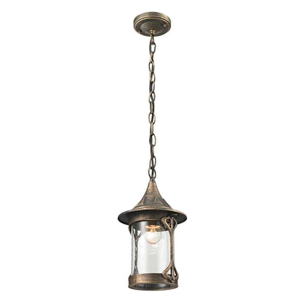 Κλασικό κρεμαστό φωτιστικό εξωτερικού χώρου (μονόφωτο) Κατασκευασμένο από κράμα αλουμινίου σε χρυσή πατίνα Ο λαμπτήρας προστατεύεται από διάφανο γυάλινο κάλυμμα.