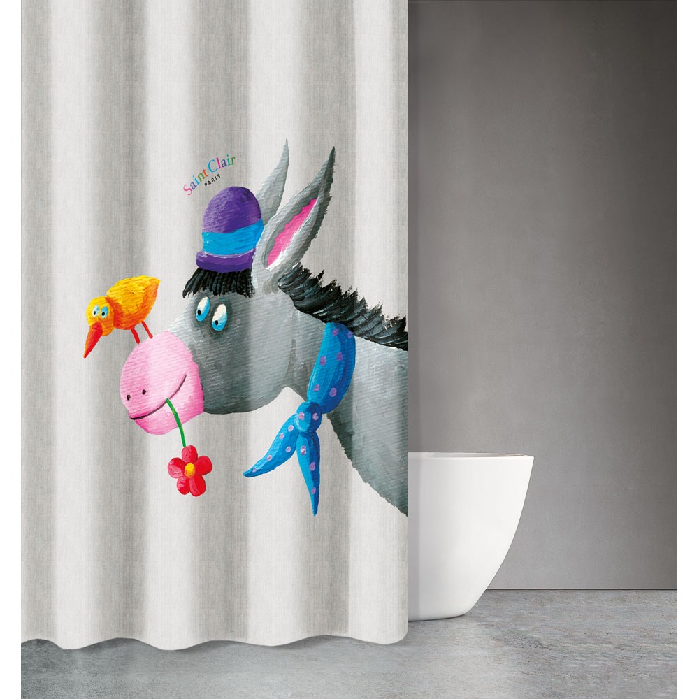 Υφασμάτινη κουρτίνα μπάνιου υδατοαπωθητική της εταιρίας Saint Clair Paris. Στεγνώνει γρήγορα και διαθέτει κρίκους για εύκολη τοποθέτηση. Χαριτωμένo cartoon σχέδιο που θα κάνει την εμπειρία του μπάνιου του μωρού σας πιο ευχάριστη.