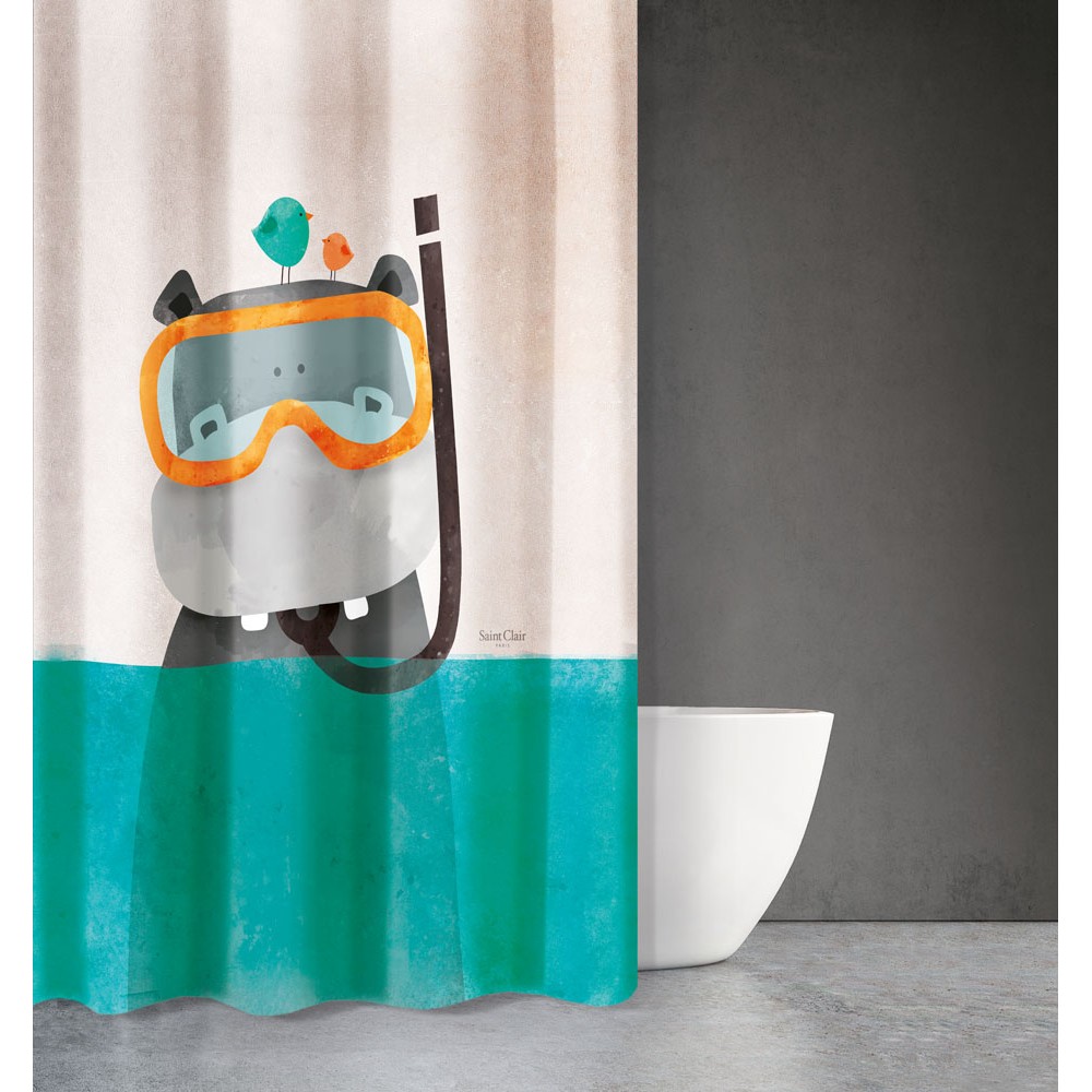 Υφασμάτινη κουρτίνα μπάνιου υδατοαπωθητική της εταιρίας Saint Clair Paris. Στεγνώνει γρήγορα και διαθέτει κρίκους για εύκολη τοποθέτηση. Χαριτωμένo cartoon σχέδιο που θα κάνει την εμπειρία του μπάνιου του μωρού σας πιο ευχάριστη.