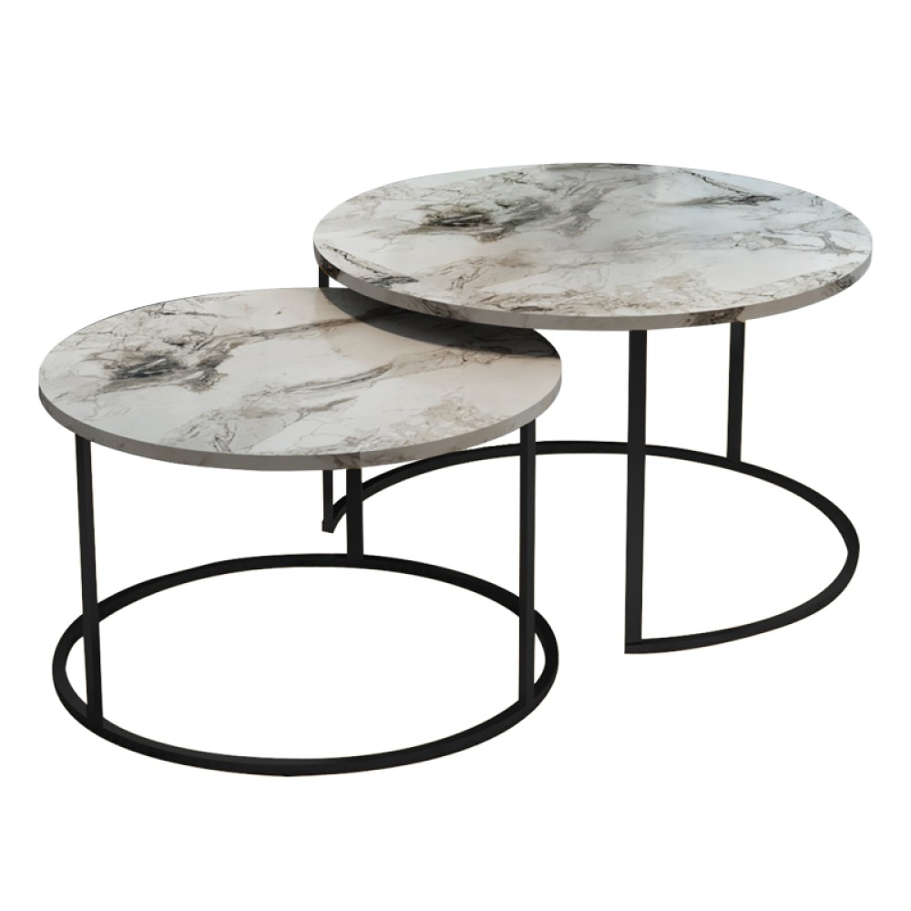 Τραπέζια σαλονιού Solme pakoworld σετ 2τεμ λευκό μαρμάρου μελαμίνης-μαύρο μέταλλο