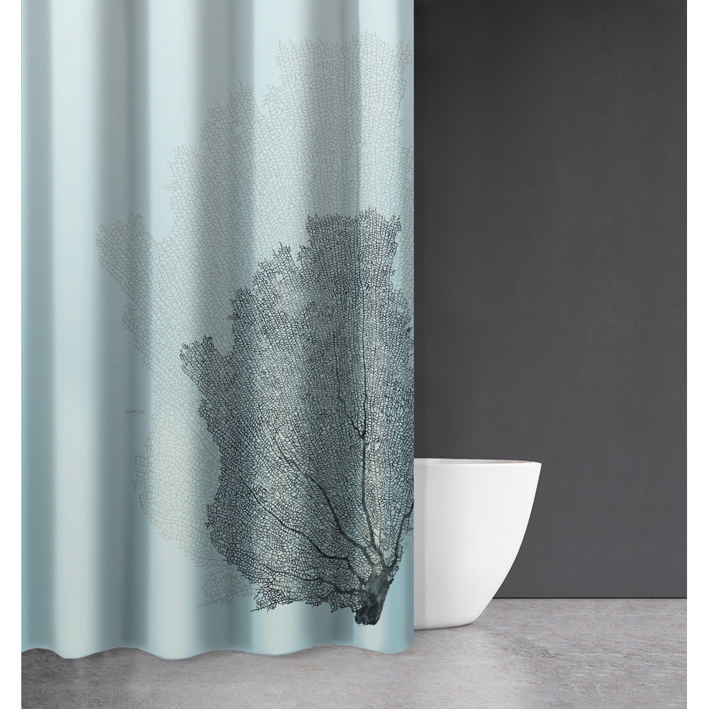 Υφασμάτινη κουρτίνα μπάνιου υδατοαπωθητική της εταιρίας Saint Clair Paris. Στεγνώνει γρήγορα και διαθέτει κρίκους για εύκολη τοποθέτηση. Σχέδιο δέντρο με κλαδιά σε παστέλ μπλέ απόχρωση.