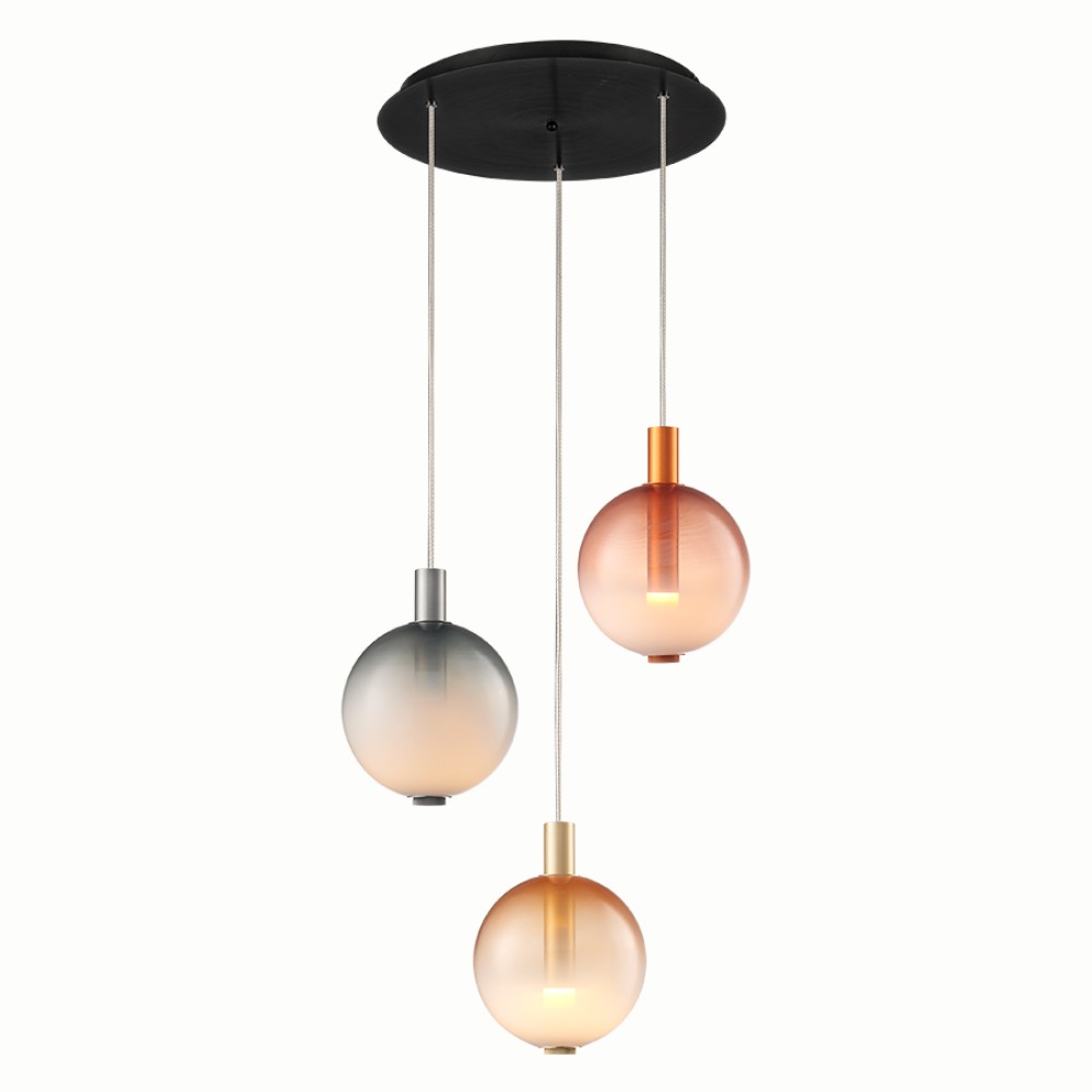 Τρίφωτο κρεμαστό φωτιστικό σε ροζέτα κατασκευασμένο από χειροποίητα γυαλιά σφουμάτα σε γκρι, μελί και απαλό ροζ χρώμα και μεταλλική βάση σε μαύρο χρώμα.