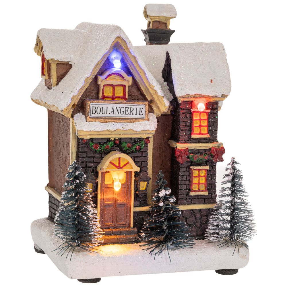 Χριστουγεννιάτικo σπιτάκι σε καφέ απόχρωση κατασκευασμένο από πολυρεζίνη. Διαθέτει led φωτισμό και λειτουργεί με μπαταρίες οι οποίες δεν περιλαμβάνονται.