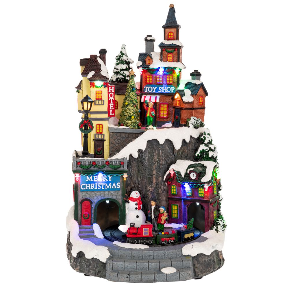 Χριστουγεννιάτικο εντυπωσιακό χωριό με πολλά φωτιζόμενα σπίτια και τρένο που γυρνάει γύρω γύρω. Εχει φως σε αρκετά σημεία και μουσική με 8 τραγούδια. Η μουσική έχει κουμπί On/Off. Λειτουργεί με ρεύμα με μετασχηματιστή 4.5V που περιέχεται.