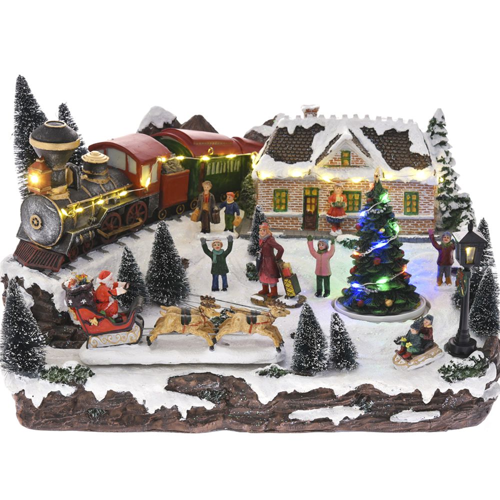 Χριστουγεννιάτικο σκηνικό χωριού με φωτιζόμενο τραινάκι. Το δένδρο γυρνάει γύρω-γύρω, το έλκυθρο πάει μπρος πίσω και παίζει και μουσική. Λειτουργεί με ρεύμα με μετασχηματιστή 4.5V που περιέχεται. Υλικό κατασκευής πολυρεζίνη και πλαστικό.