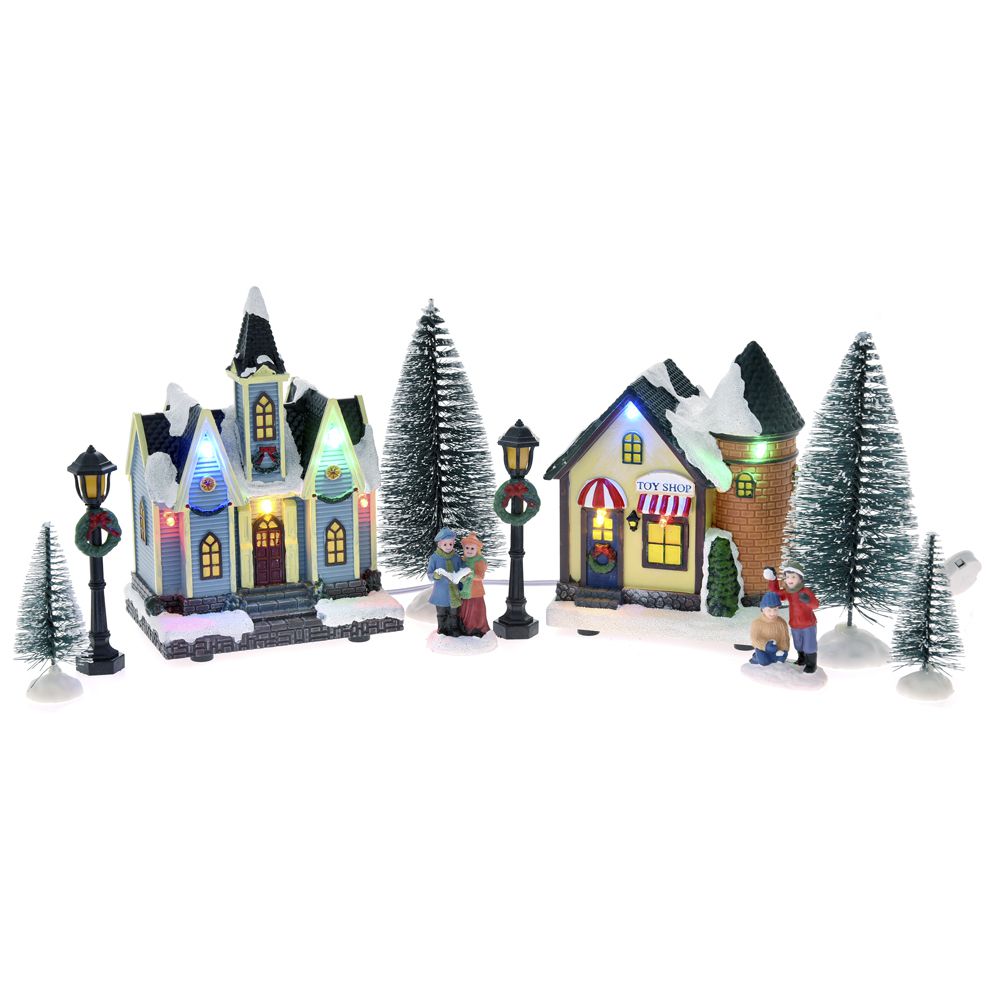 Συνολικά 10 τεμάχια.Τα σπιτάκια έχουν φως απο μπαταρίες 2ΑΑ οι οποίες δεν περιέχονται.