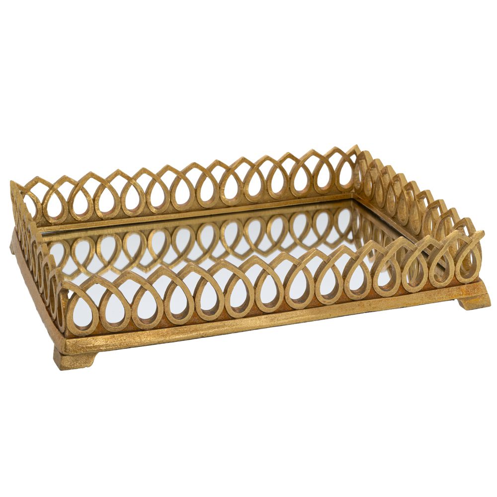 Χρυσός ματ σκαλιστός δίσκος κατασκευασμένος από πολυρεζίνη και επιφάνεια καθρέφτη. Διάσταση: 33Χ24Χ7ΕΚ.