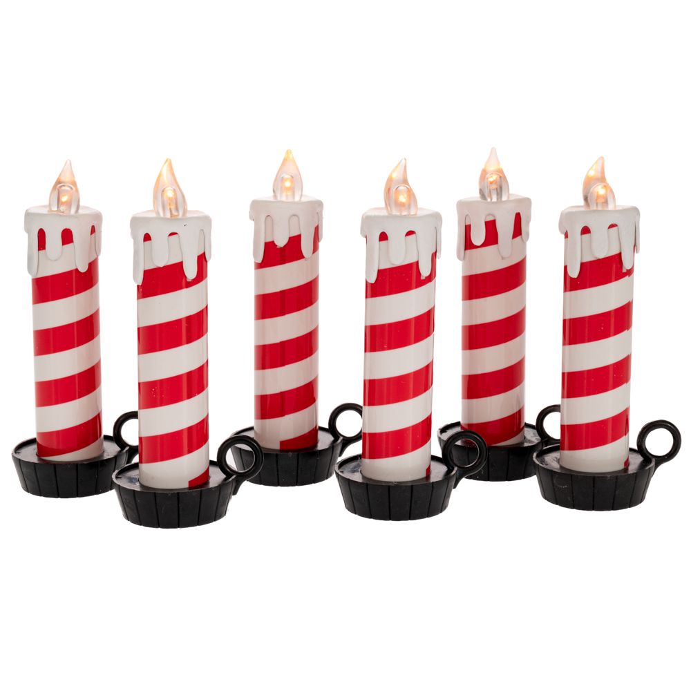 Διακοσμητικά led κεριά σε στυλ candy cane. Είναι σετ των 6, με εναλλαγή κόκκινων και λευκών ριγών έτσι ώστε να θυμίζουν γλειφιτζούρι ή ζαχαρωτό Χριστουγέννων.