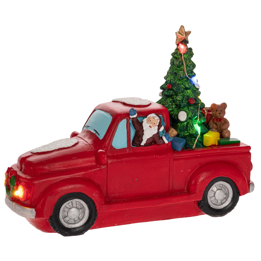 Χριστουγεννιάτικο φορτηγάκι σε κόκκινο χρώμα με οδηγό τον Άγιο Βασίλη. Η καρότσα έιναι γεμάτη με δώρα καθώς και με ένα στολισμένο δέντρο με led φωτάκια.