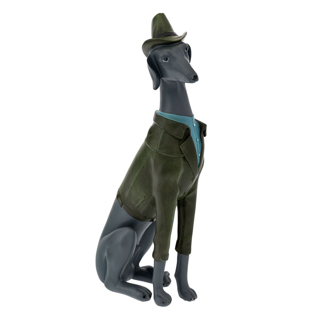 Μοντέρνα φιγούρα σκύλου με καπέλο και κοστούμι σε γκρι χρώμα. Ιδανικό για μοντέρνα διακόσμηση! Χαρακτηριστικά: •Διάσταση: 16Χ42εκ •Υλικό: Πολυρεζίν •Χρώμα: Γκρι
