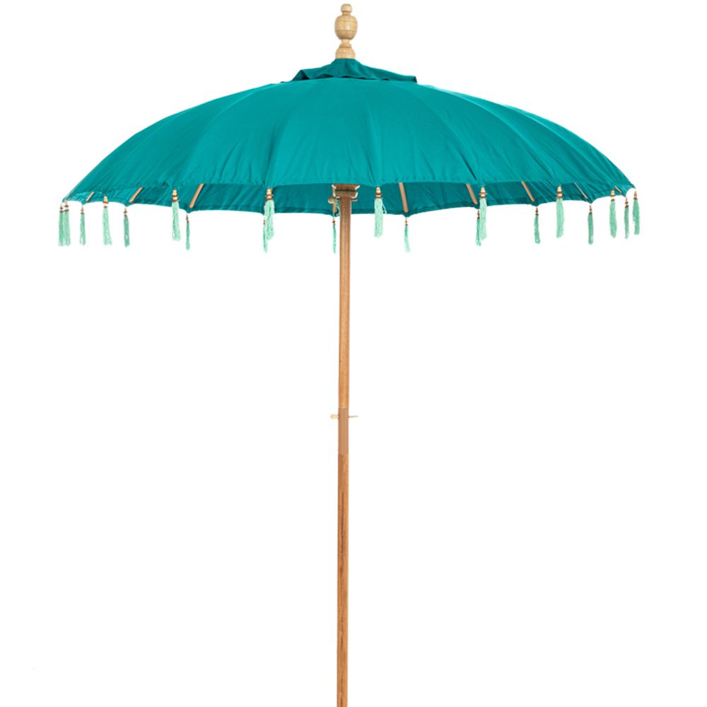 Ομπρέλα μακραμέ BALI γαλάζιο φ185εκ. χ260εκ.υψος. Το ύψος είναι 180εκ.στα κρόσια και 230εκ.στην κορυφή ενω στο εσωτερικό ειναι 210εκ.περίπου.