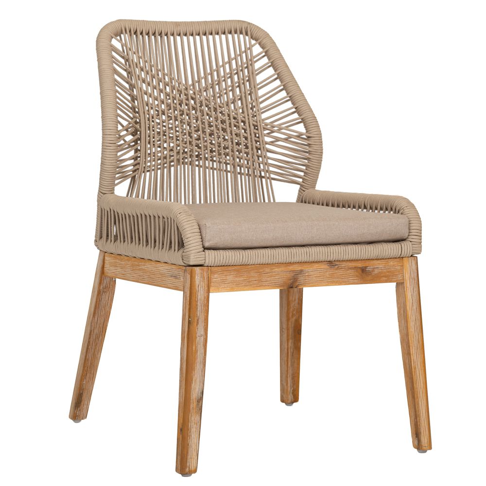 Η πλάτη της είναι φτιαγμένη με περίτεχνη πλέξη μπεζ σχοινιού αμπακά και διαθέτει υφασμάτινο μαξιλάρι στο ίδιο χρώμα.