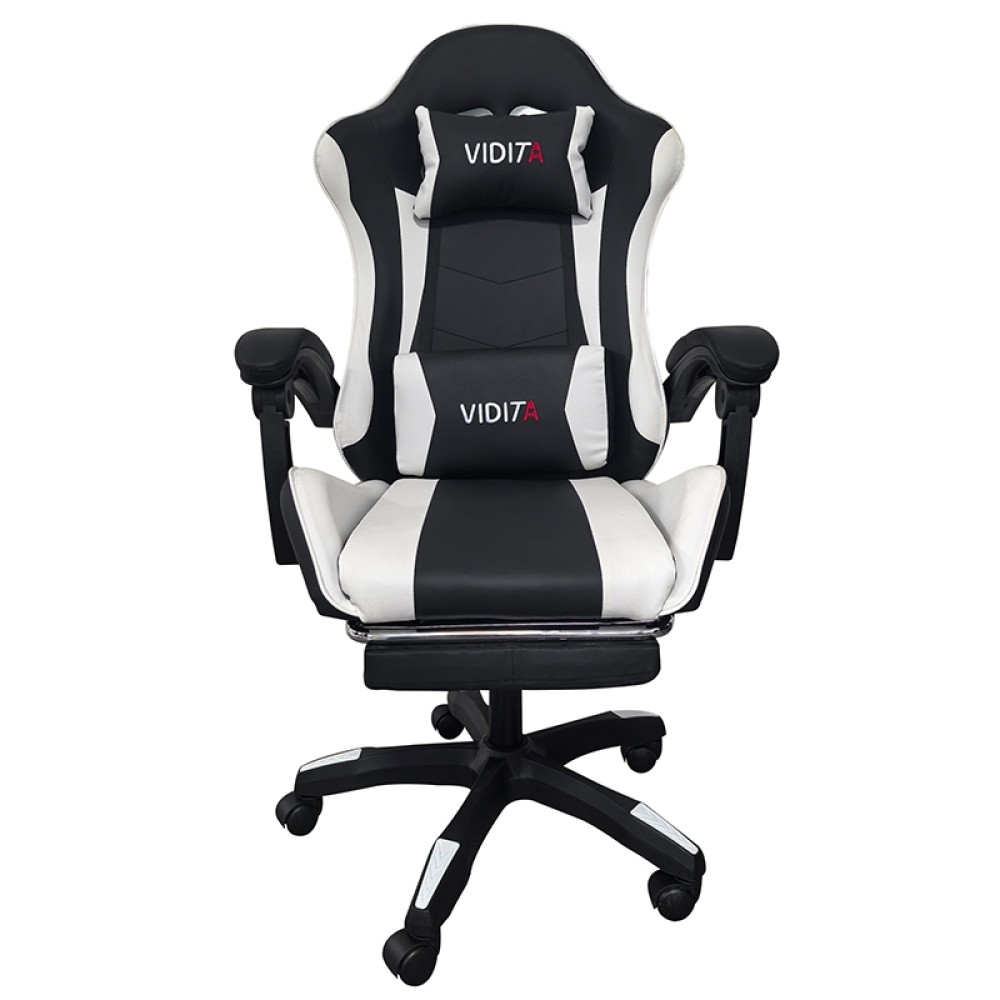 A6060 gaming πολυθρόνα με ιδιαίτερο design.Περιμετρικά η πλάτη,το προσκέφαλο και το κάθισμα σε χρώμα μαύρο/λευκό PU.Διαθέτει μαξιλάρι για την μέση και το κεφάλι που προσφέρει μεγαλύτερη άνεση και επεκτεινόμενο υποπόδιο για μεγαλύτερη ξεκούραση.Με ρυθμιζόμενο ύψος και άνετα μπράτσα.