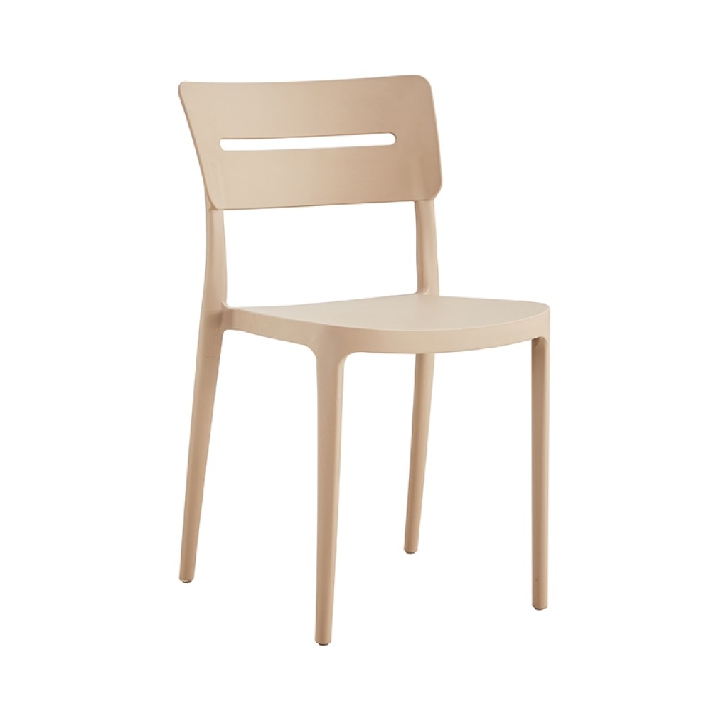 Emily καρέκλα σε χρώμα cappuccino κατασκευασμένη από πολυπροπυλένιο με μοντέρνο σχεδιασμό στην πλάτη.Είναι στοιβαζόμενη για εξοικονόμηση χώρου και εύκολη αποθήκευση.Κατάλληλη για εσωτερική και εξωτερική χρήση.