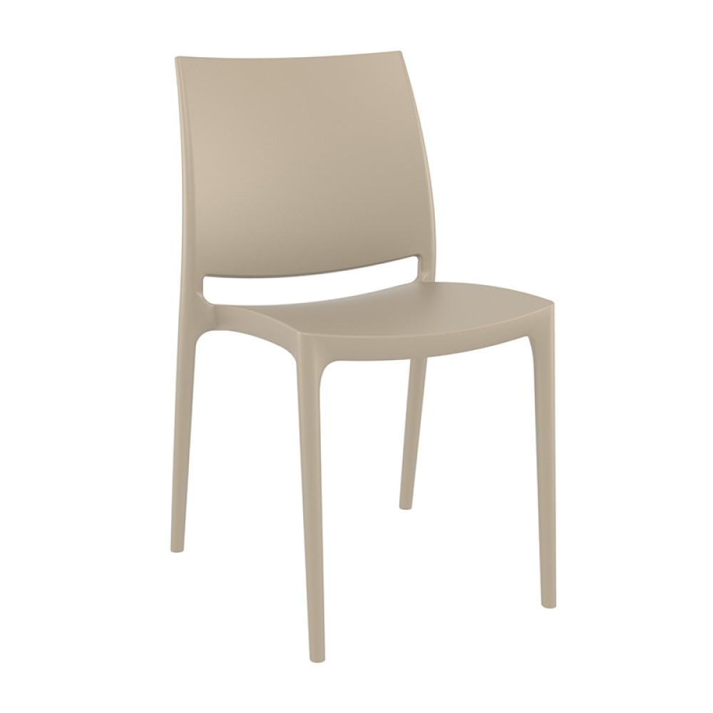 Maya καρέκλα του οίκου Siesta σε χρώμα taupe με μοντέρνο σχεδιασμό και άνετο κάθισμα. Κατασκευασμένη από πολυπροπυλένιο με 20% fiber glass για απόλυτη αντοχή στο χρόνο. Κατάλληλη για εσωτερική και εξωτερική χρήση, είναι στοιβαζόμενη για εύκολη αποθήκευση.Ιδανική επιλογή για επαγγελματικούς χώρους. Πιστοποιημένο προϊόν από τον Ιταλικό οίκο CATAS.