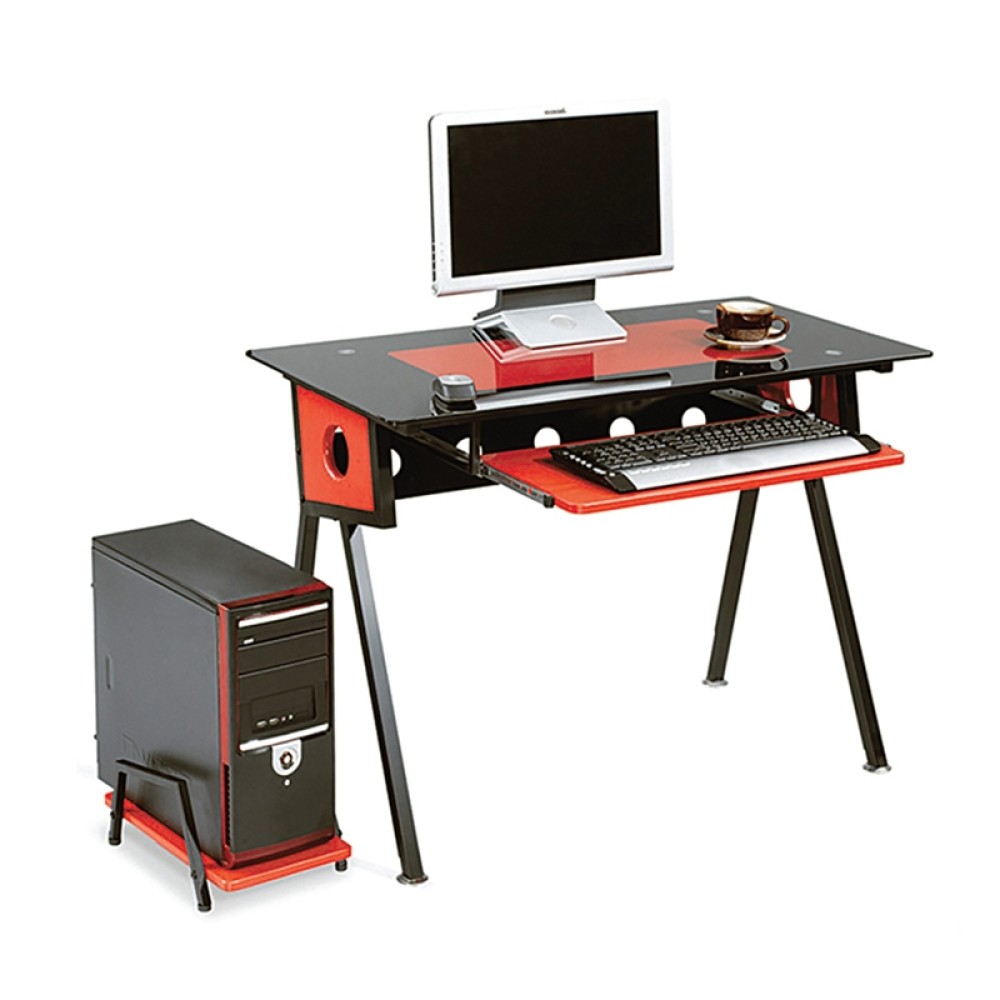 Γραφείο υπολογιστή με μεταλλικό σκελετό βαφής και επιφάνεια με γυαλί ασφαλείας σε χρώμα μαύρο/κόκκινο.Διαθέτει συρόμενη βάση για το πληκτρολόγιο του υπολογιστή σας καθώς και ξεχωριστή βάση για τον πύργο του υπολογιστή.