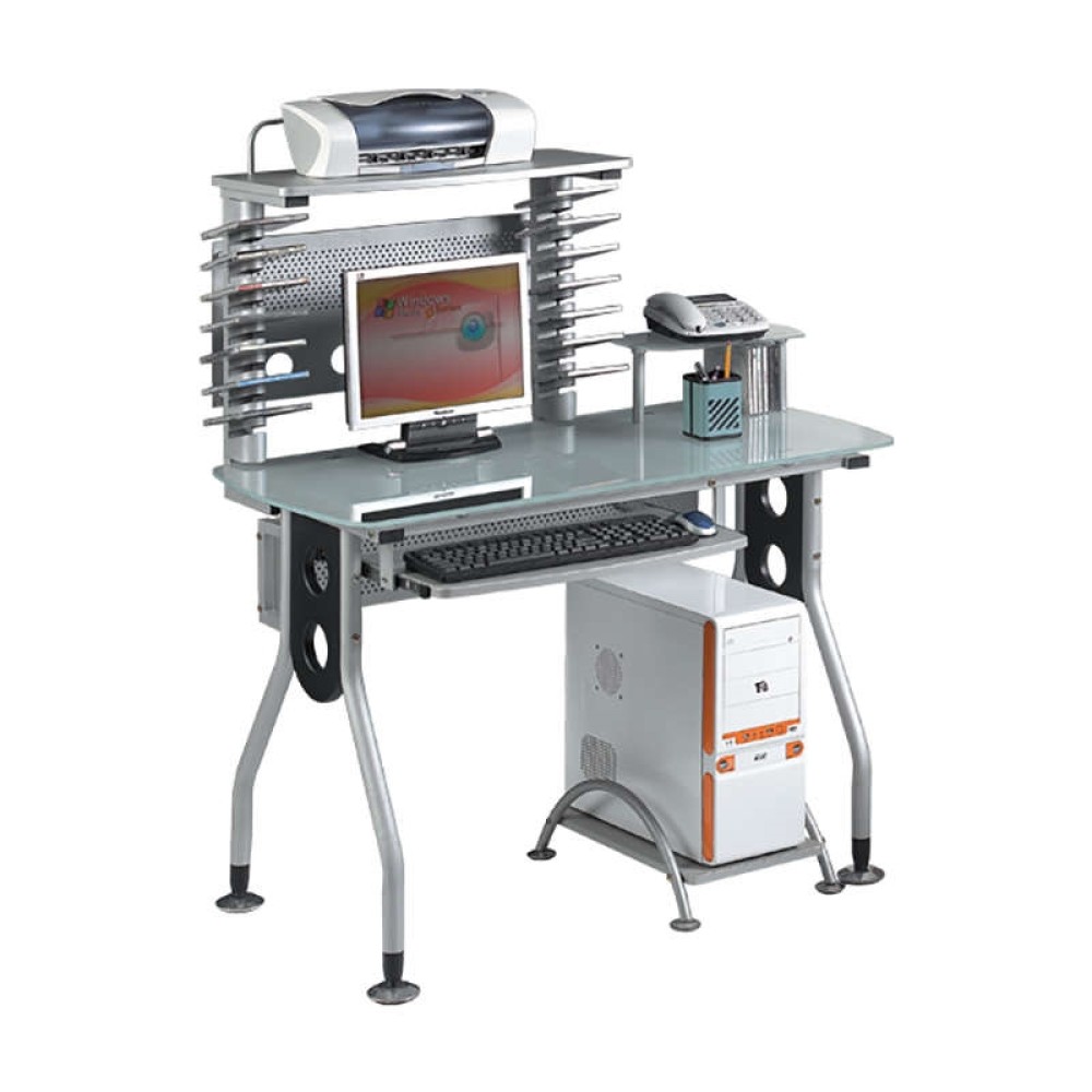 Γραφείο υπολογιστή,μεταλλικό μοντέρνου σχεδιασμού με σκελετό βαφής και επιφάνεια με γυαλί ασφαλείας αμμοβολής.Με δύο έξτρα υπερυψωμένα ράφια και θήκες για CD'S.Διαθέτει συρόμενη βάση πληκτρολογίου και έξτρα βάση για τον πύργο του υπολογιστή.