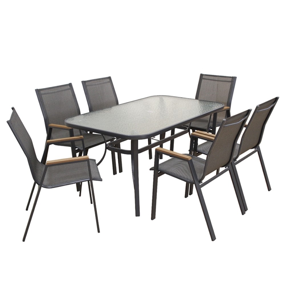 Selby set με μεταλλικό σκελετό σε χρώμα ανθρακί. Το σετ αποτελείται από 6 πολυθρόνες και 1 τραπέζι με γυαλί ασφαλείας. Ένα σετ κατάλληλο για τον κήπο ή την βεράντα σας.