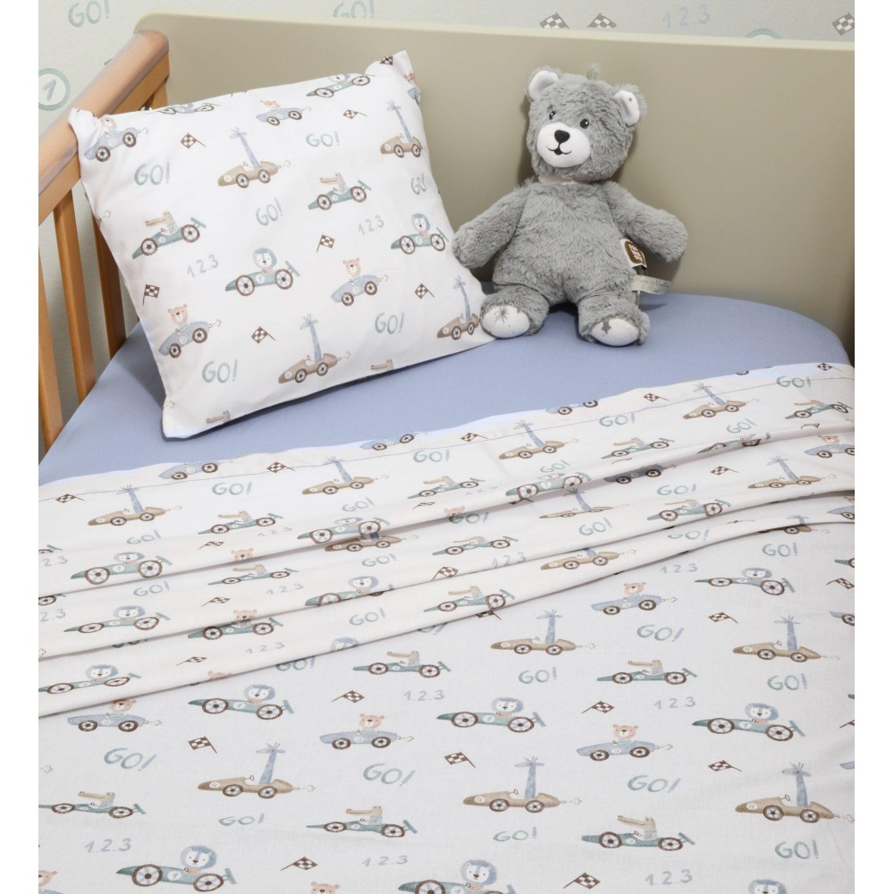 Πανωσέντονο εμπριμέ από 100% βαμβάκι 144 κλωστών με πιστοποίηση Oekotex. - Κατωσέντονο με λάστιχο, μονόχρωμο, για στρώμα 70x140cm. - Μαξιλαροθήκη 30x40cm. - Συσκευάζεται ως σετ σε κουτί. - Ελληνικής ραφής.