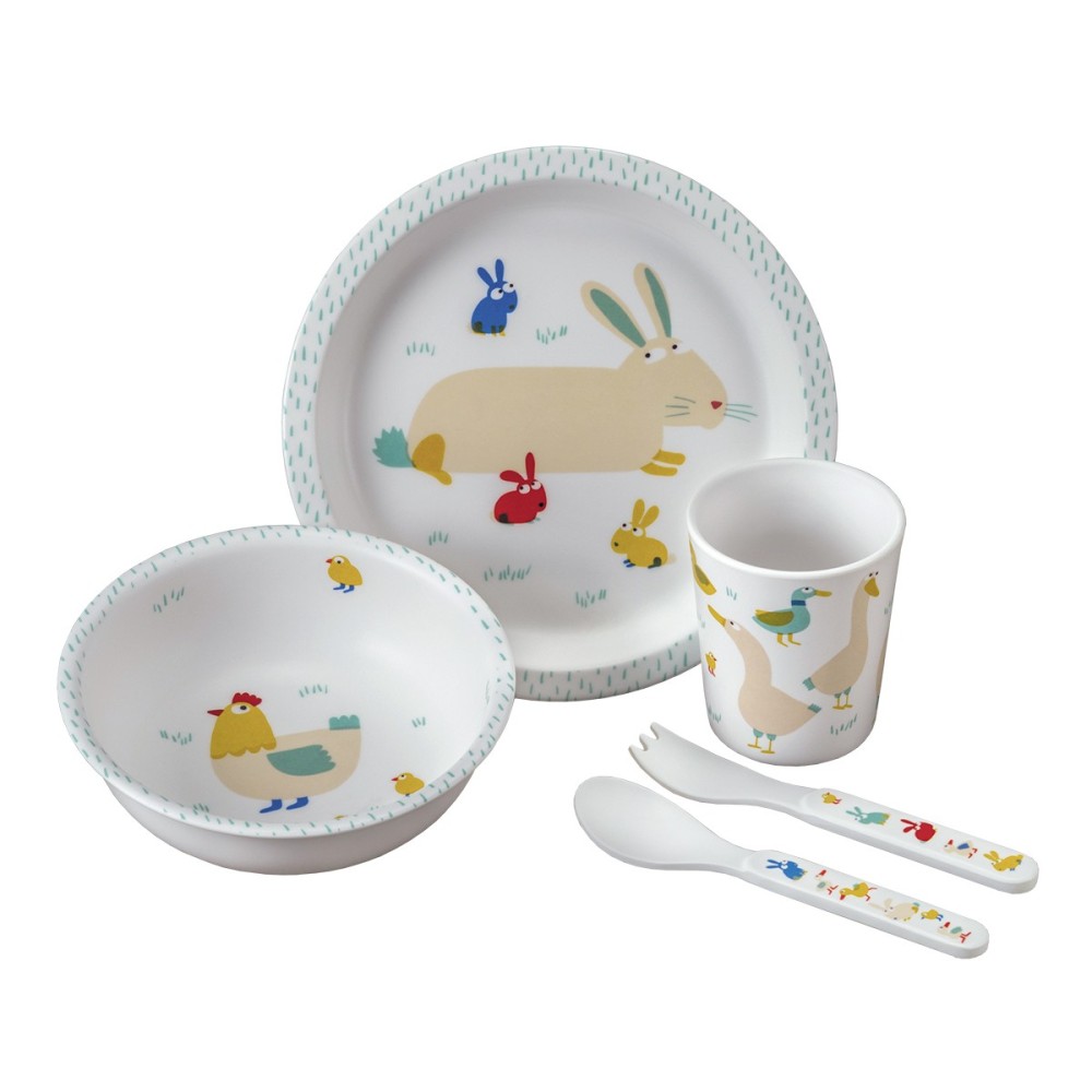 Αυτό το σετ δώρου 5 τεμαχίων περιλαμβάνει όλα όσα χρειάζεται ένα παιδί για να έχει ένα ευχάριστο και ασφαλές γεύμα: ένα πιάτο, ένα μπολ, ένα σετ μαχαιροπήρουνων 2 τεμαχίων και ένα ποτήρι.