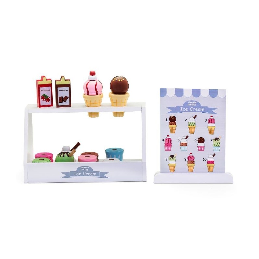 Το κατάστημα παγωτού MAMAMEMO® περιέχει όλα όσα χρειάζονται τα παιδιά για την κατασκευή, την πώληση και την αγορά πολύχρωμων, ξύλινων παγωτών σε χωνάκι και κυπελάκι.