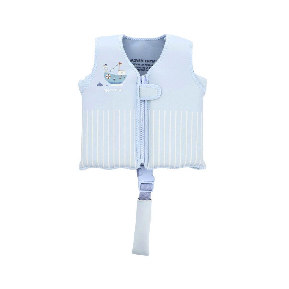 Το γιλέκο ασφαλείας Monnëka διαθέτει λουράκι με κλείσιμο ασφαλείας για να τοποθετείται ανάμεσα στα πόδια ώστε το γιλέκο να μην φεύγει πάνω από το κεφάλι, κατά τη βουτιά στο νερό, ή κατά τη διάρκεια της κολύμβησης.