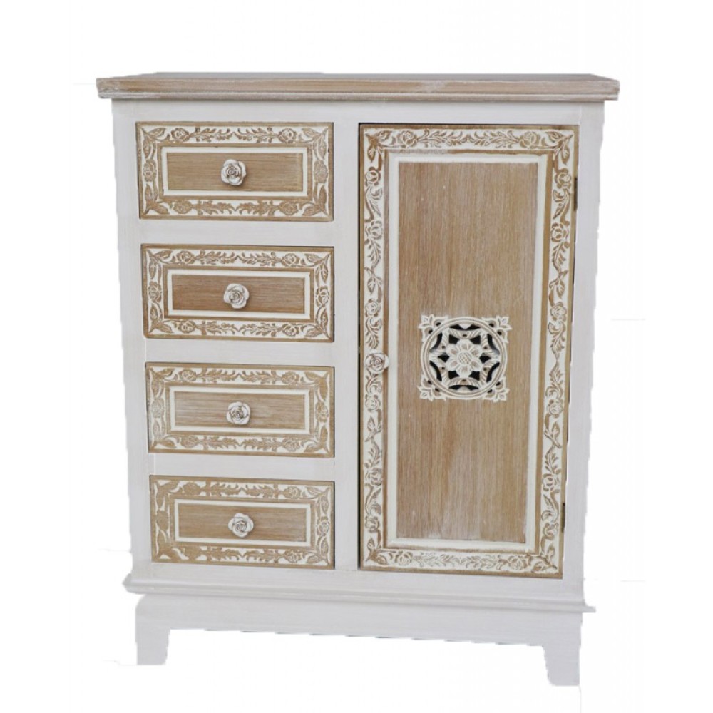 Κομόντα Ξύλινη Με Διχρωμία .Διαθέτει Τέσσερα Συρτάρια Και Ένα Ντουλάπι Με Σκαλιστά Ανάγλυφα Στο Περίγραμμα Και Πόμολα Σε Σχέδιο Τριανταφύλλου .