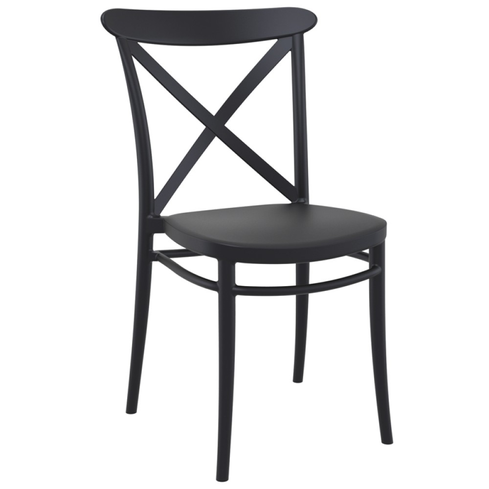Καρέκλα CROSS του οίκου Siesta σε μαύρο χρώμα, με design υψηλής αισθητικής. Κατασκευασμένη από πολυπροπυλένιο με 20% fiber glass για απόλυτη αντοχή στον χρόνο. Κατάλληλη για εσωτερική και εξωτερική χρήση, στοιβαζόμενη,ιδανική επιλογή και για επαγγελματικούς χώρους.Πιστοποιημένο προϊόν από τον Ιταλικό οίκο CATAS.
