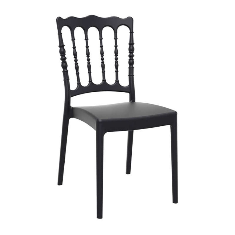 Καρέκλα NAPOLEON του οίκου Siesta σε μαύρο χρώμα, κατασκευασμένη από πολυπροπυλένιο με 20% fiber glass για απόλυτη αντοχή στο χρόνο.Κατάλληλη για εσωτερική και εξωτερική χρήση,στοιβαζόμενη,ιδανική επιλογή και για χώρους δεξιώσεων.Πιστοποιημένο προϊόν από τον Ιταλικό οίκο CATAS.