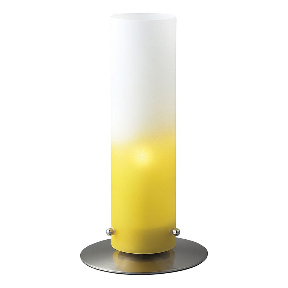 Επιτραπέζιο φωτιστικό (μονόφωτο πορτατίφ) με μεταλλική βάση σε νίκελ ματ και γυαλί κίτρινο και λευκό χρώμα.