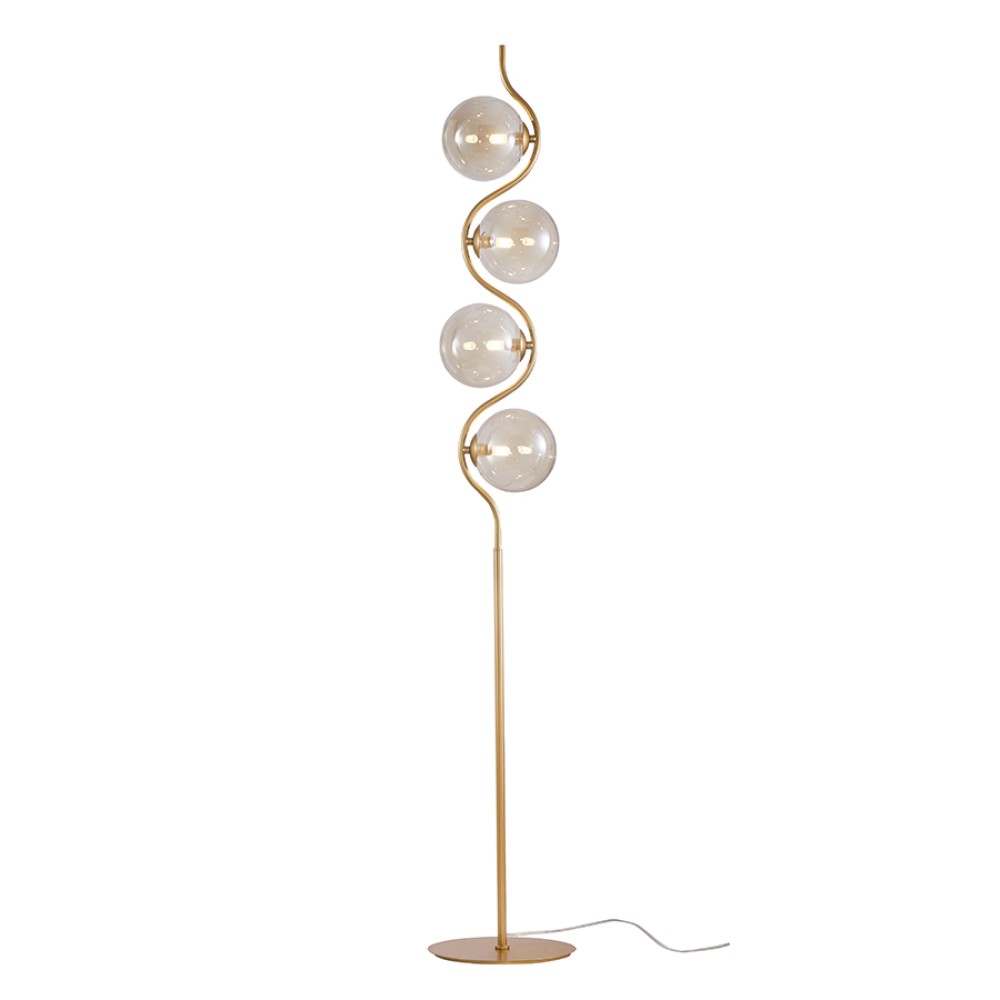 Τετράφωτο επιδαπέδιο φωτιστικό κατασκευασμένο από χειροποίητο γυαλί cognac και μεταλλικό σκελετό σε χρυσό χρώμα .