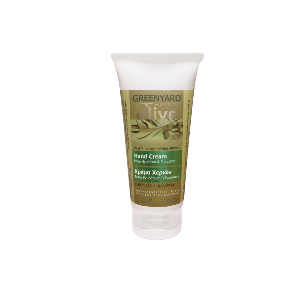Κρέμα Χεριών (Hand Cream) 100 ml. της Greenyard με ελιά, αμύγδαλο και μέλι. Βαθιά Ενυδάτωση & προστασία. Πλούσια, ενυδατική σύνθεση εντατικής περιποίησης, με βελούδινη υφή που απορροφάται εύκολα, τρέφει και επανορθώνει το ευαίσθητο δέρμα ενώ προστατεύει από ερεθισμούς, από την πρόωρη γήρανση και τους εξωτερικούς παράγοντες. Όλα τα προϊόντα Greenyard φτιάχνονται στην Ελλάδα, είναι δερματολογικά ελεγμένα και κατασκευάζονται με βάση το εξαιρετικά παρθένο ελαιόλαδο από την Κρήτη και εκχυλίσματα φύλλων ελιάς. Είναι πλούσια σε ενεργά συστατικά, βιταμίνες και φυτικά εκχυλίσματα.