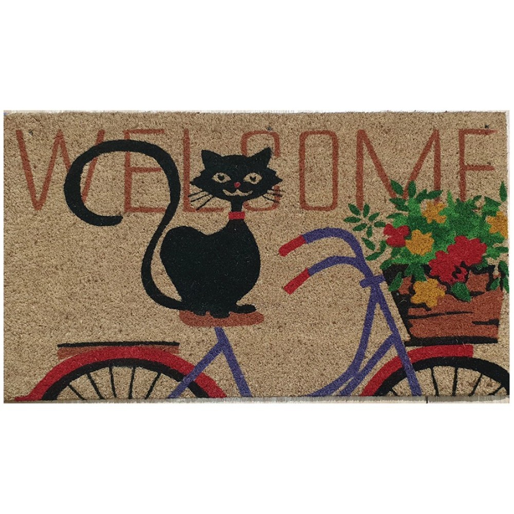 Χαλάκι εισόδου "Γάτα πάνω σε ποδήλατο" από ίνες κοκοφοίνικα και αντιολισθητικό λάστιχο 40x60cm