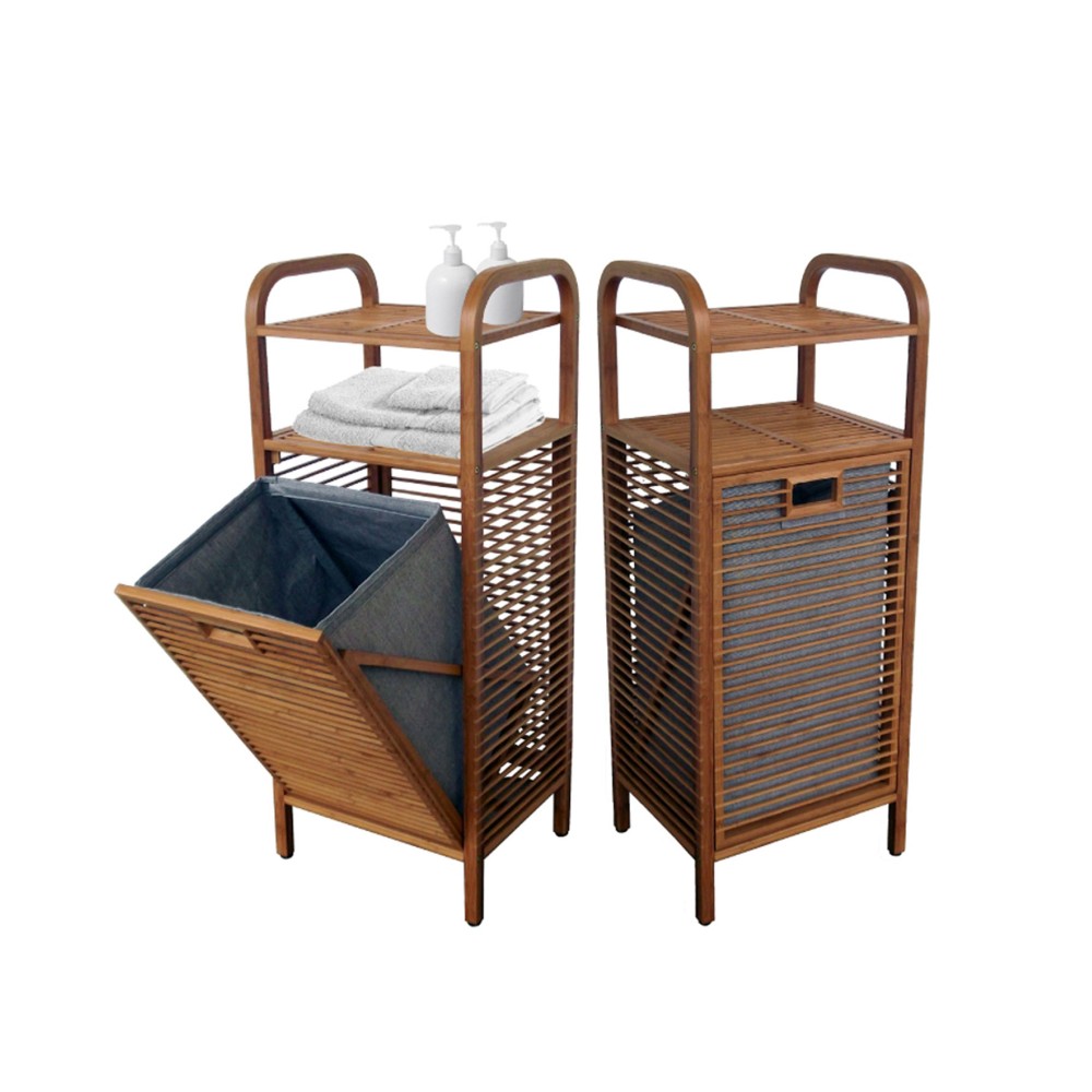 Καλάθι απλύτων με ράφια bamboo ποιότητας teak με ύφασμα που πλένεται στο πλυντήριο. Με δύο ράφια ώστε να τοποθετήσετε επιπρόσθετα και ό,τι άλλο χρειάζεστε (πετσέτες, αξεσουάρ, καλλυντικά κτλ). Ανθεκτικό στην υγρασία και στο νερό, αυτό το καλάθι θα σας ενθουσιάσει για την πρακτικότητα και την καλαισθησία του! Κατάλληλο για κάθε μπάνιο, για τα άπλυτα ή τα πλυμένα ρούχα που θέλετε να αποθηκεύσετε!