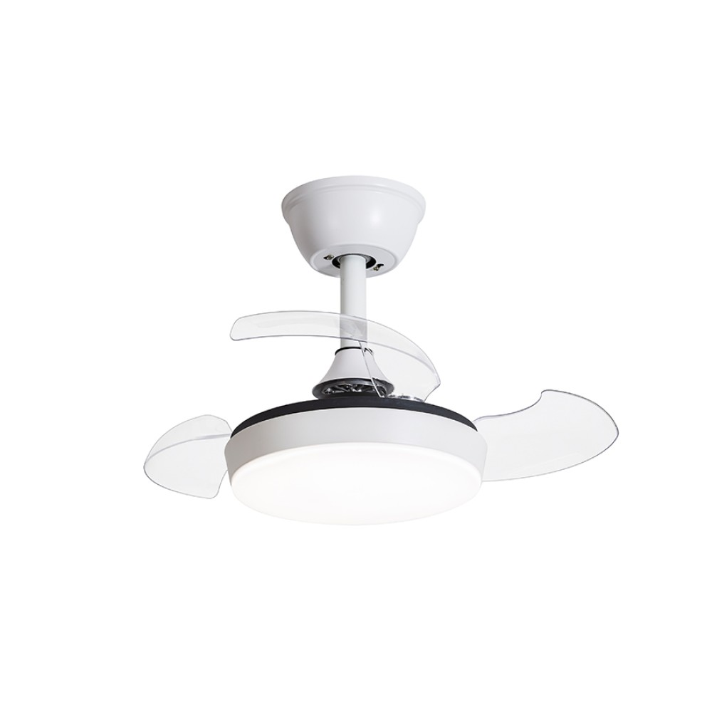Ανεμιστήρας οροφής με φως και DC μοτέρ για αθόρυβη λειτουργεία. Διαθέτει τηλεχειριστήριο και πτυσσόμενα πτερύγια. Η βάση είναι από αλουμίνιο, σε λευκό χρώμα, ενώ τα πτερύγια είναι ακρυλικά σε διάφανο χρώμα.