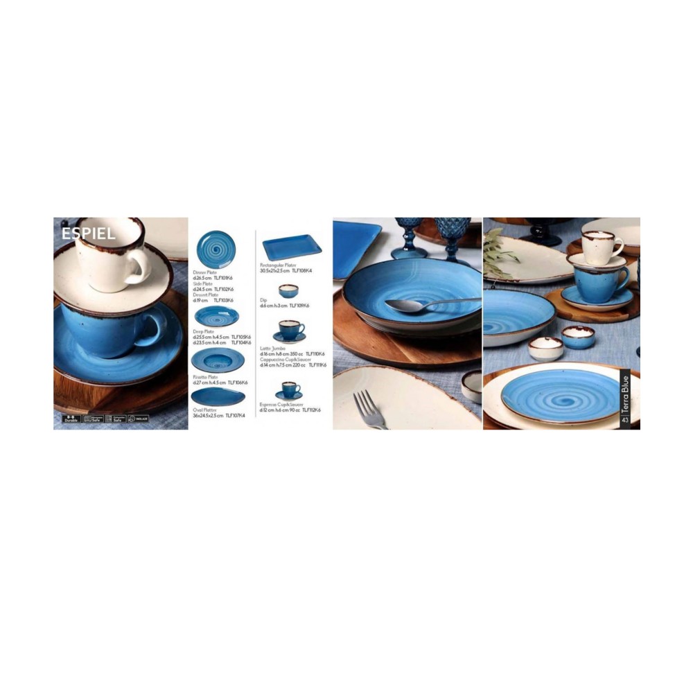 Η συλλογή ''TERRA BLUE'' με το ιδιαίτερο μοτίβο και τις λεπτομέρειες στις άκρες θα αναδείξει με τέλειο τρόπο το φαγητό σας. Συνδυάστε τα είδη μεταξύ τους και δώστε γήινο ύφος στον τραπέζι σας ! - The ''TERRA BLUE'' series with their special pattern and rim details will highlight your food. Combine the items together for a natural style at your dining table !