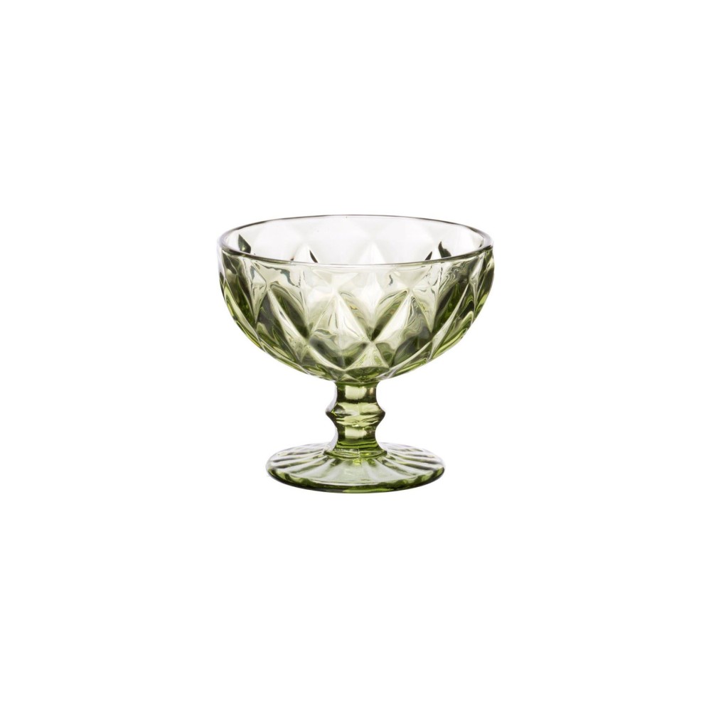 Σετ μπωλ παγωτού πράσινα από τη σειρά Kare με την υπογραφή της εταιρείας Cryspo Trio. Το σετ αποτελείται από 6 μπωλ, κατασκευασμένα από φυσητό γυαλί με vintage σχεδιασμό και μοτίβο ανάγλυφων ρόμβων. Έχουν χωρητικότητα 310 ml και είναι κατάλληλα για πλύσιμο στο πλυντήριο πιάτων.