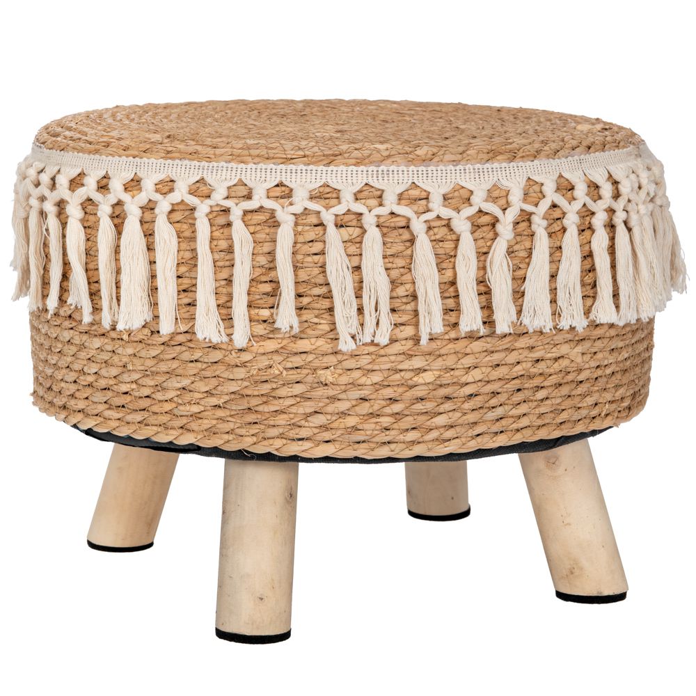 Πλεκτό σκαμπό ψάθινο με ξύλινα πόδια σε φυσικό χρώμα και λευκά κρόσια περιμετρικά σε Boho στυλ. Διάσταση: 28Χ40ΕΚ
